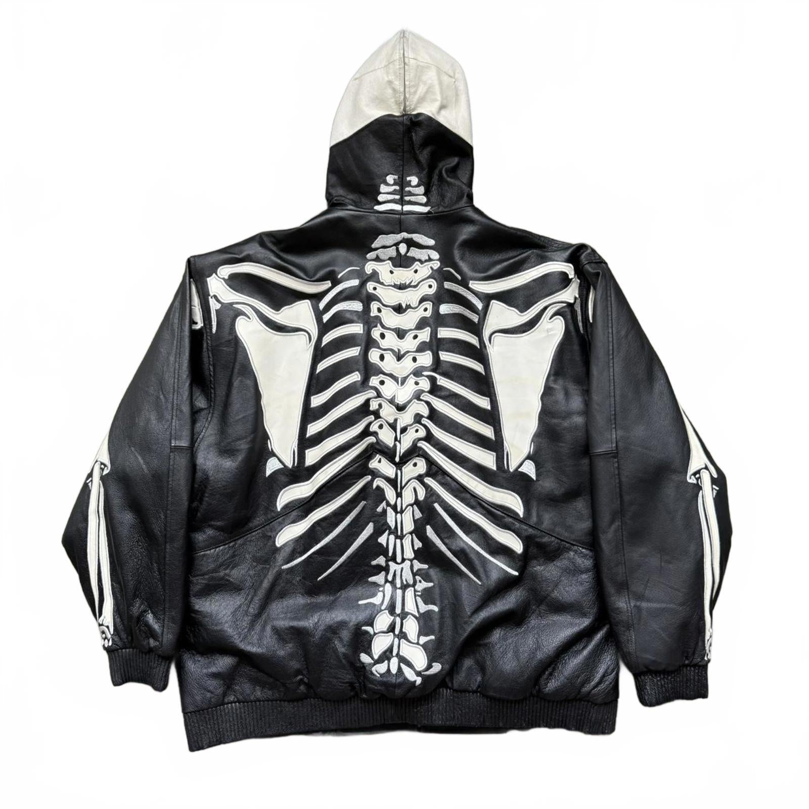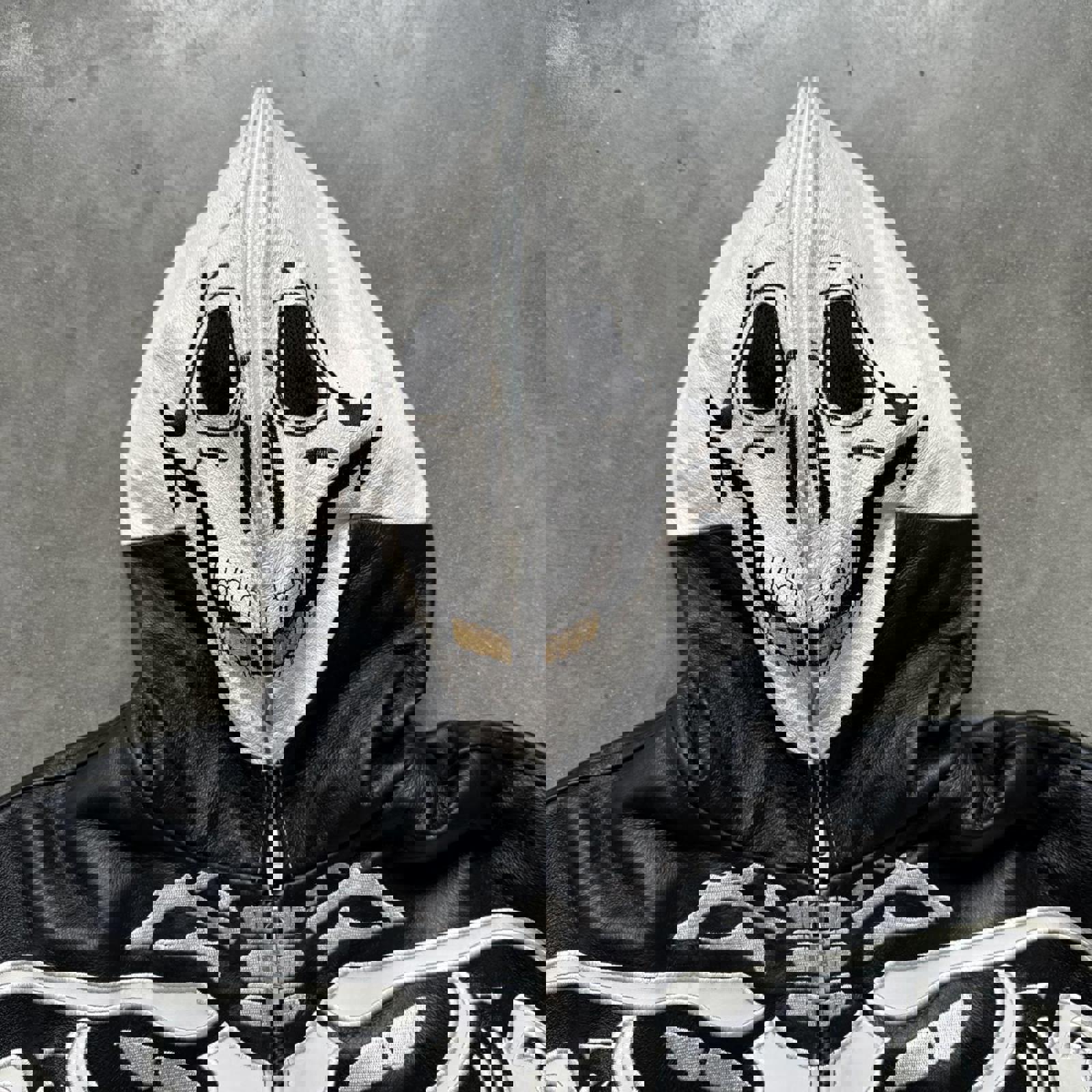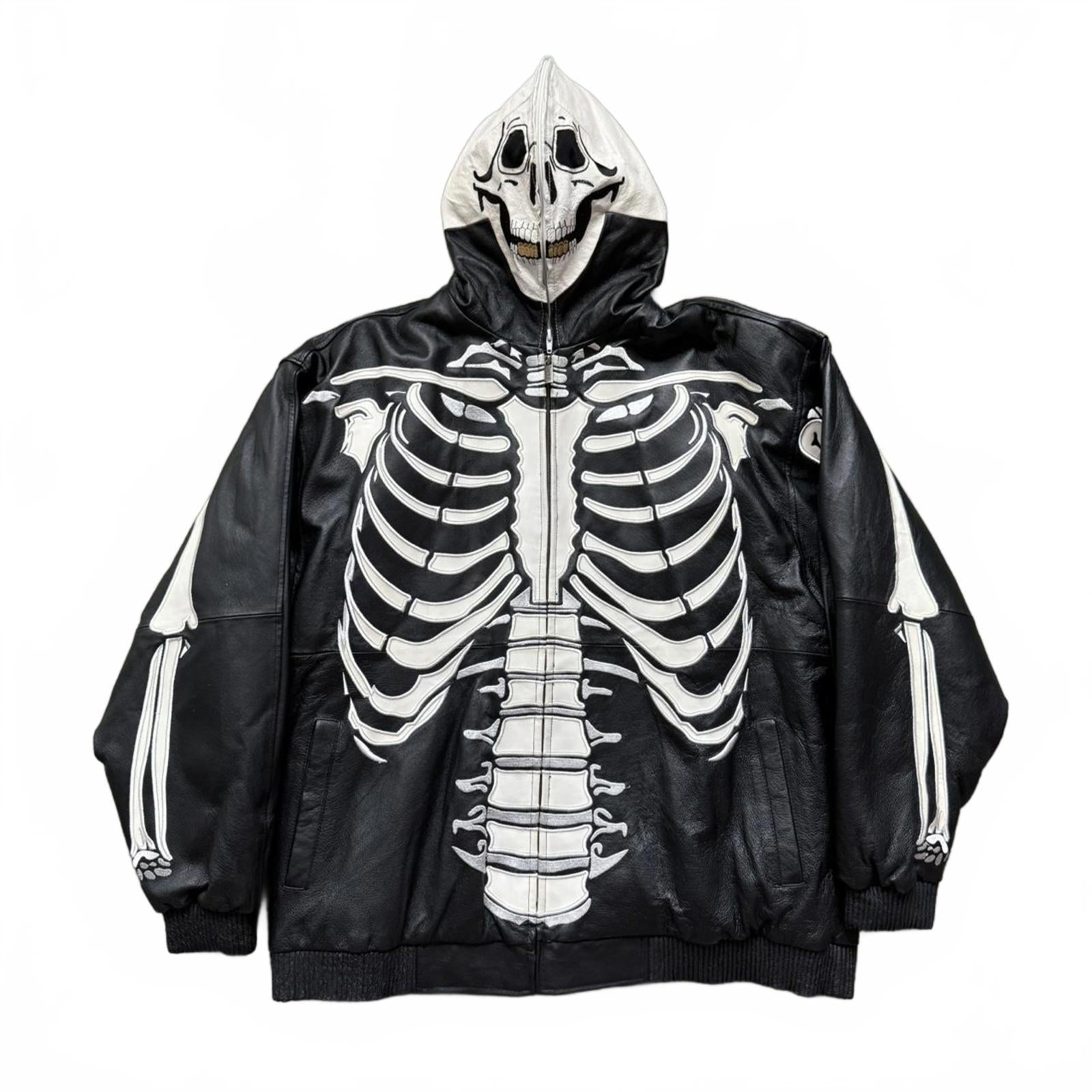 Vintage Y2k Vilanto French Embroidered Skeleton Leather Full Zip Up Jacket with Hood, Mask & Hidden Pockets